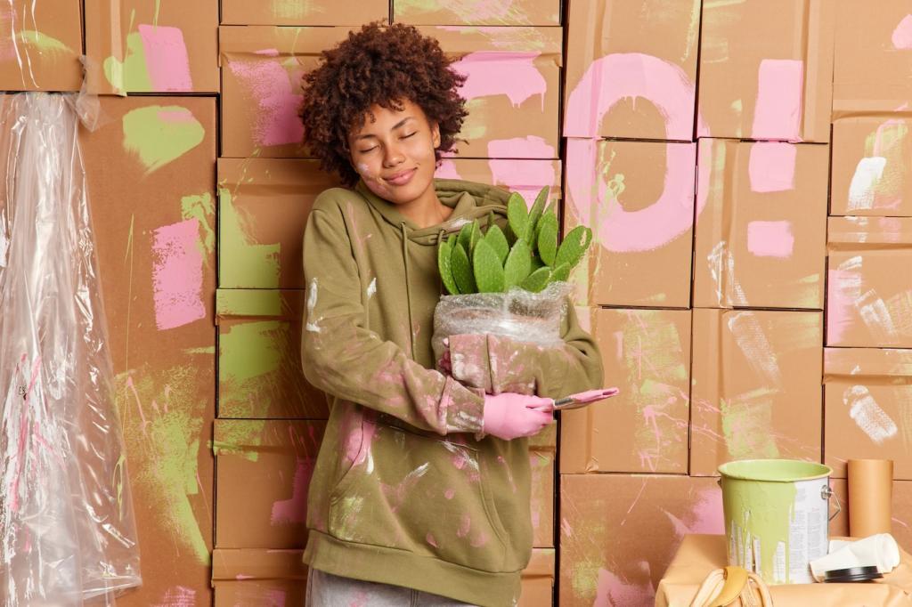 Leichter Dampf löst Schmutz, doch Abstand und niedrige Temperatur sind entscheidend. Direktes, langes Sonnenlicht bleicht aus; am besten lüften Sie im Schatten. So erhalten Sie Farbe und Struktur. Haben Sie Tipps gegen Sommerhitze am Fensterplatz? Schreiben Sie uns Ihre Ideen für sanften Schutz.